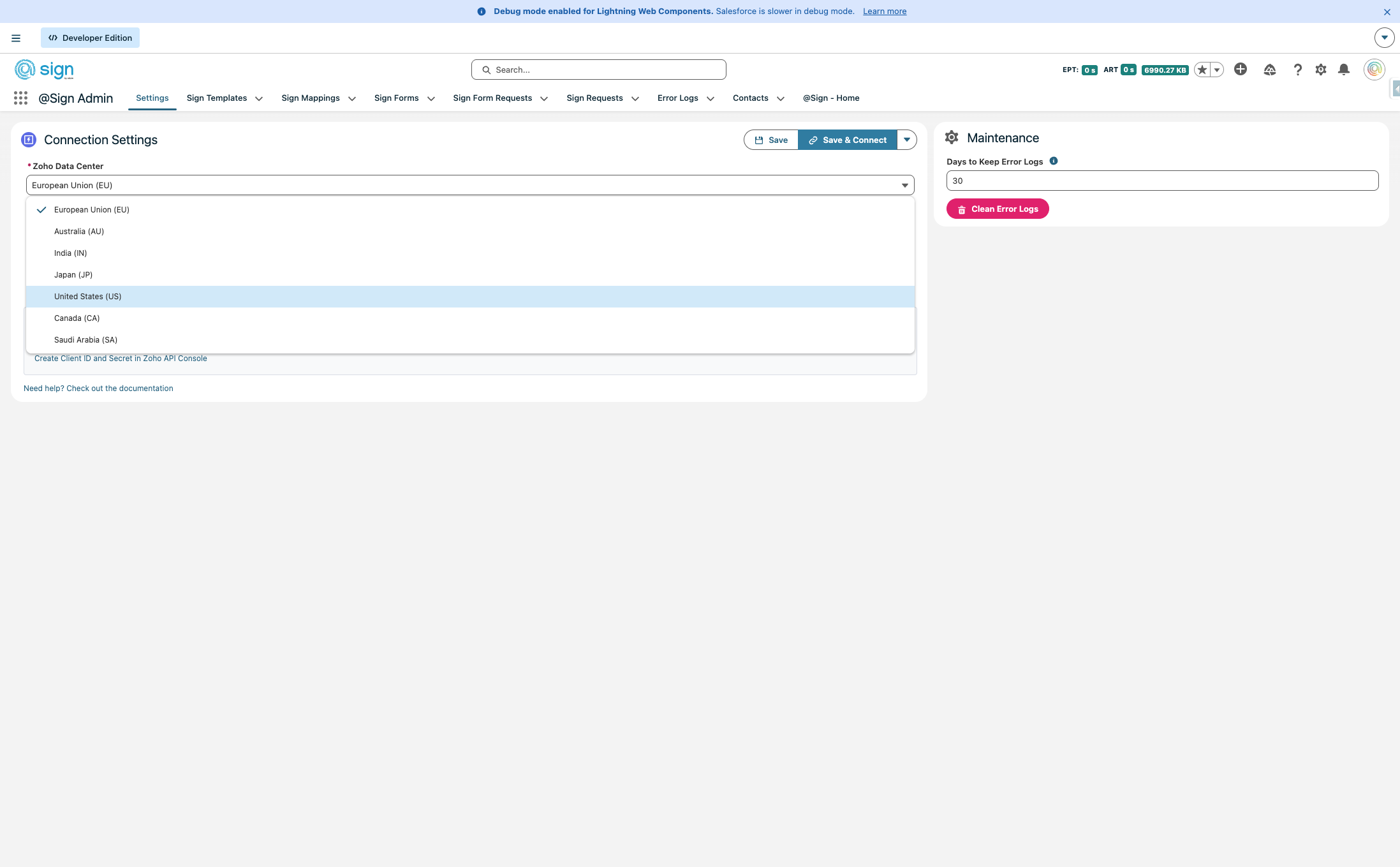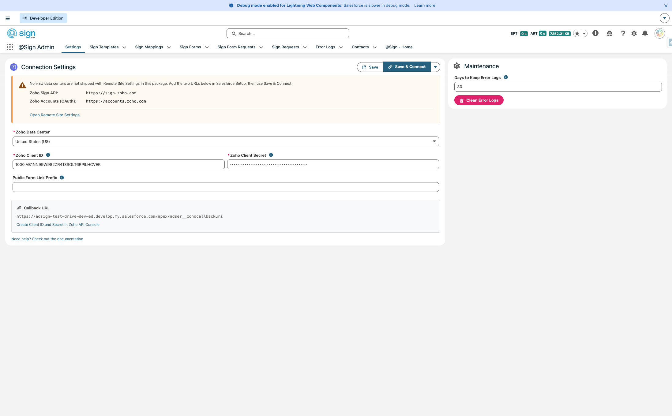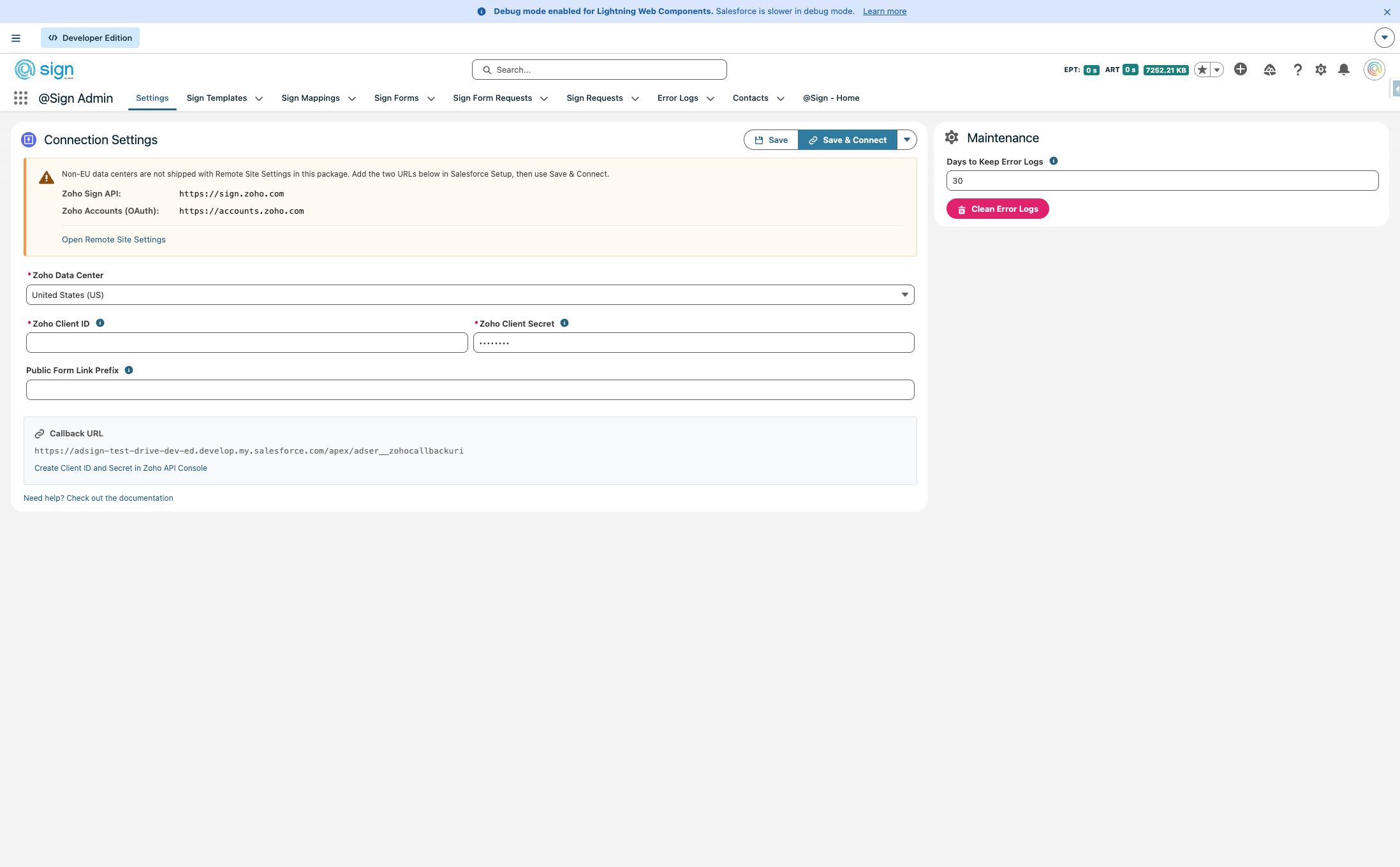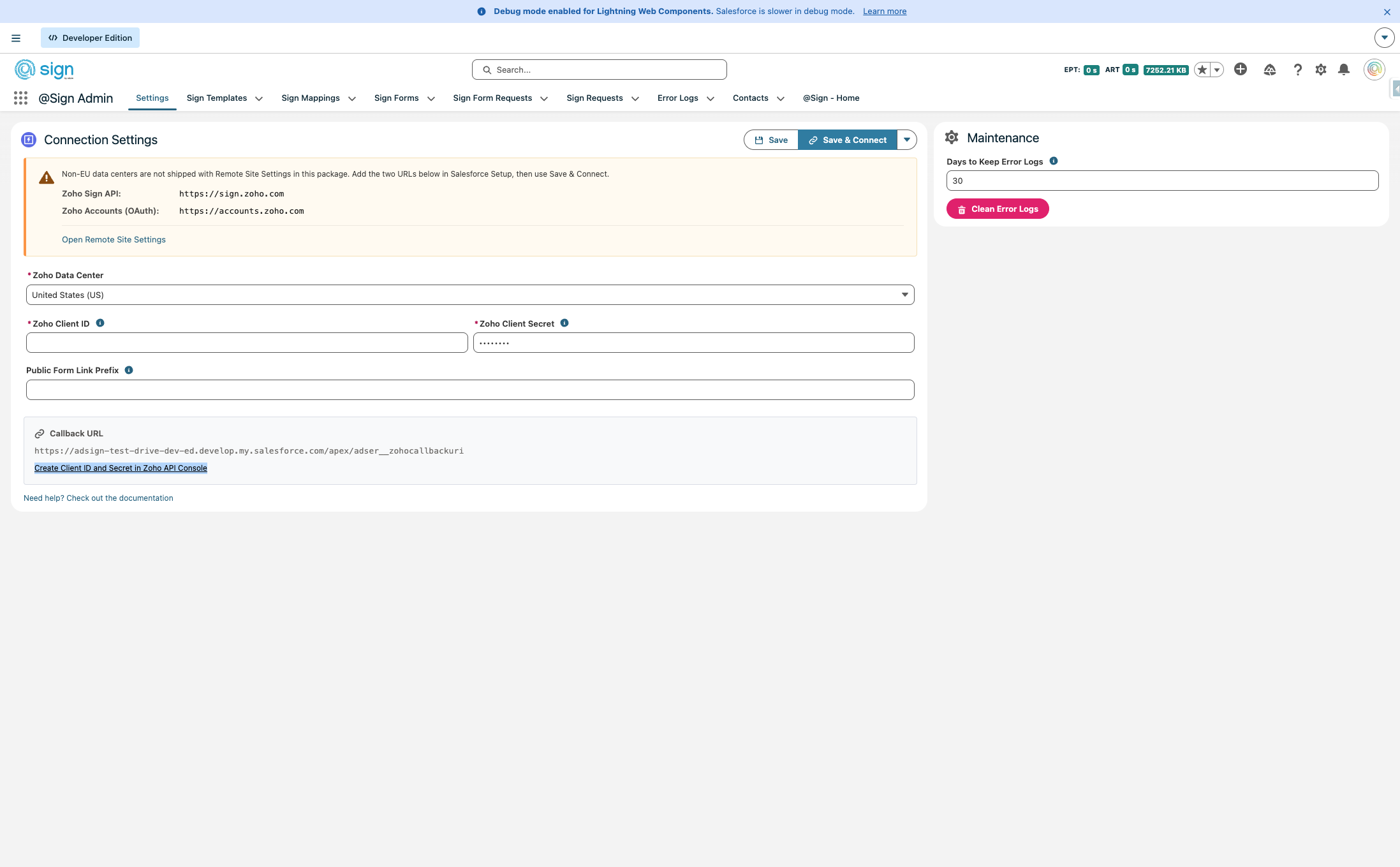 The first thing you need to do is figure out in which data center you're in. You can do this by navigating to Zoho Sign and see what extension the URL has (.com is the US, .eu is Europe, etc.). We, will set it up for the EU. At the bottom of the screen you can see the callback URL, will need it later.