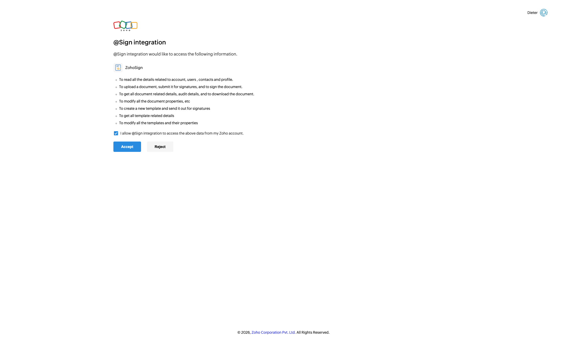 Check "I allow @Sign integration to access the above data from my Zoho account."