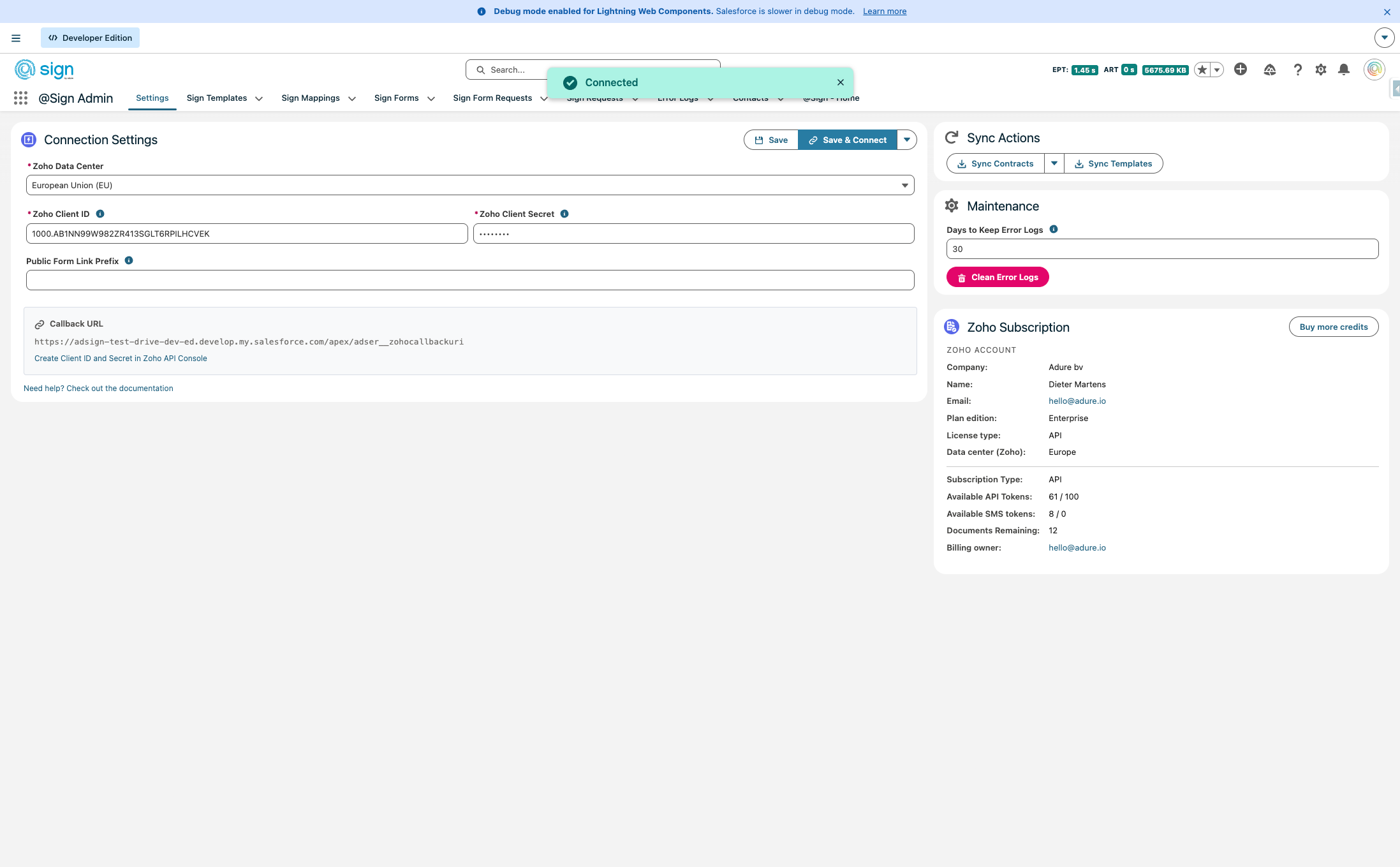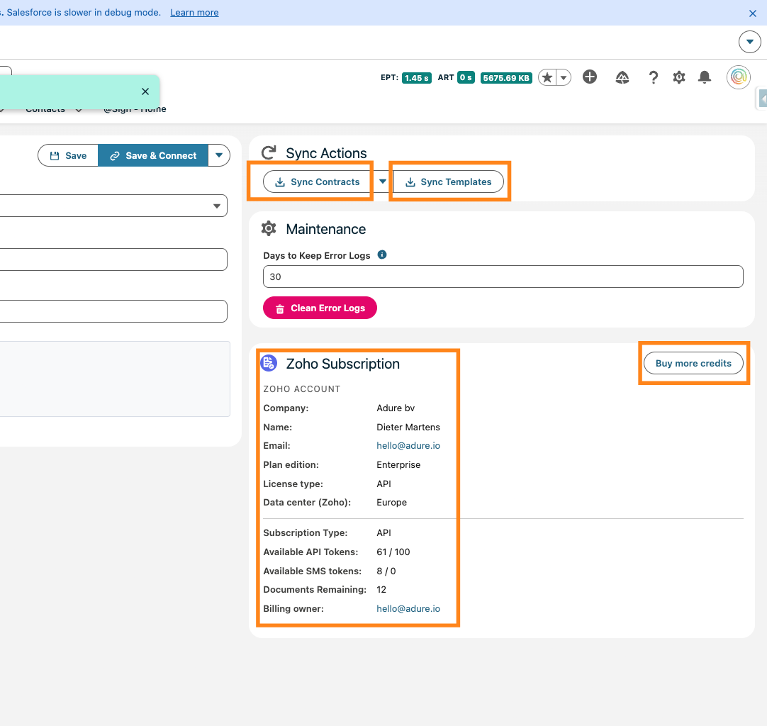 Once connected the sync actions will become available. You can for the integration here to sync the pending contracts, or all the templates. You can also see the Zoho Sign subscription information, like Company name, contact of the signed in user, available credits, subscription plan, datacenter, ... You can also use the "Buy more credits" button to add API tokens to your subscription easily.